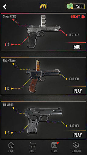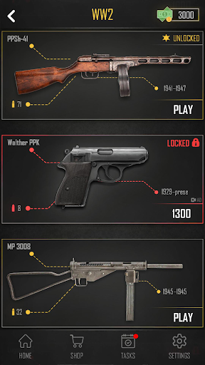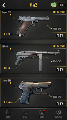 Immerse yourself in the world of virtual guns and weapons with amazing gun sound effects and high-quality gun graphics this gun weapon simulator game offers. Try out your gun shooting skills in the built-in shooting range game and score as many points as you can to beat your opponent and unlock new levels. Complete the list of tasks and collect rewards, which you can then use to unlock new guns and weapons, or shop items of your choice. Put your knowledge to practice and enjoy many options in this free weapon simulation app. The settings menu lets you adjust: vibration, flash, sound and background music. One of the best gun simulator games offers a unique experience to everyone who enjoys gun shooting.