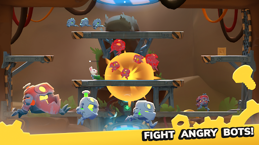 Jump between platforms to avoid enemies and get to new boxes. Shoot the bots, because if you just ignore them, they will reach the portal below and return twice as angry… and twice as fast!