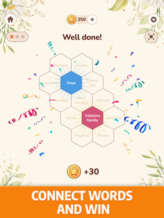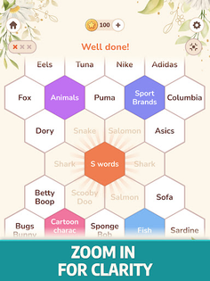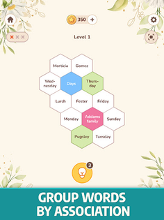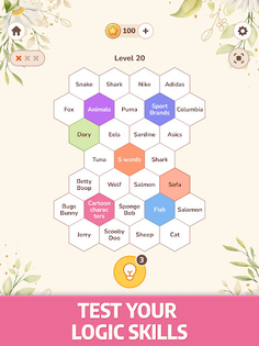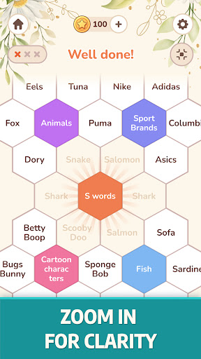 When you put a word into the correct position, the hexagon turns green and locks in place. Complete all categories before running out of moves to win the level. Some puzzles have just two groups, while others can include up to ten categories — enough to stretch your brain and your vocabulary.