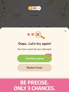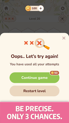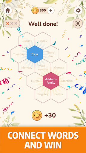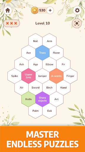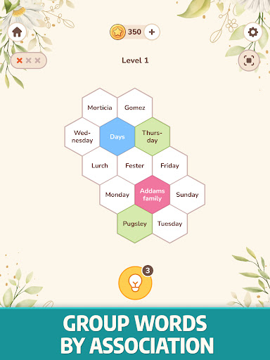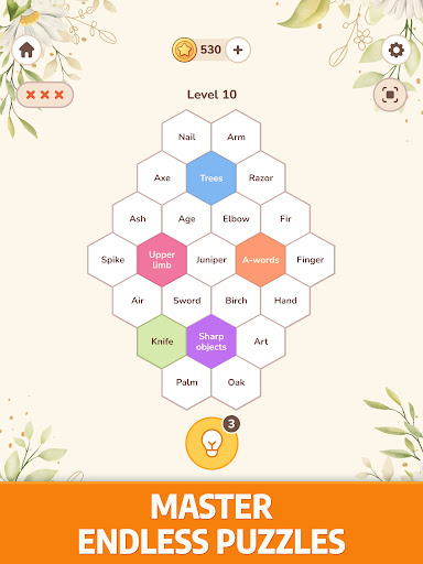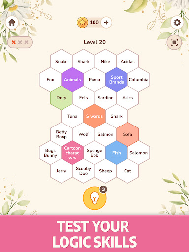 Each level is a clever word connect challenge full of hidden links and logic twists. Your goal is simple but tricky: place words inside hexagon cells so that each group belongs to one category. Every category holds six words, and one mistake can cost you a life — you have only three tries per level!
