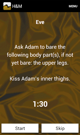 This game can help you to revive your kissing life as a married couple. For one hour you will be taking turns doing some actions that involve kissing each other. Starting from simple romantic kissing, the atmosphere will gradually become more and more intense. Before you know, you are making out, sliding into a long sensual foreplay session. You will get passionate, things will get erotic. Clothes will be shed and your lips and tongues will be all over each other's body. Even down there? Well, that's up to you!