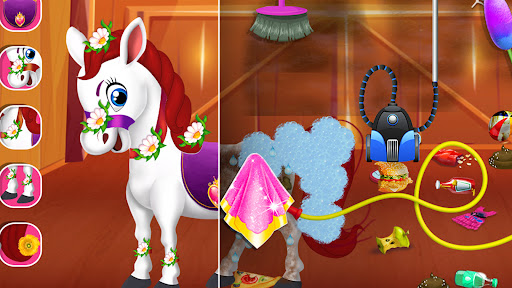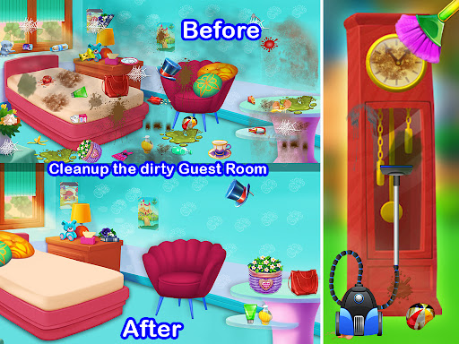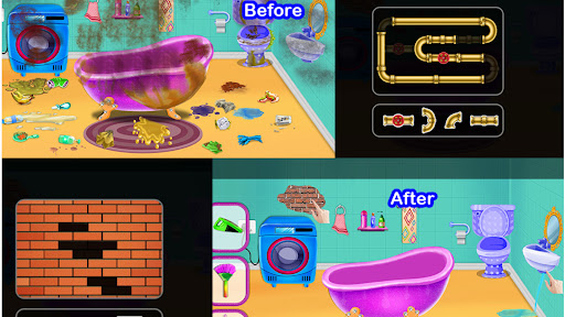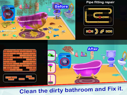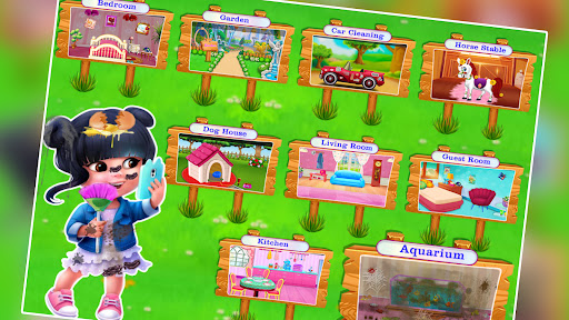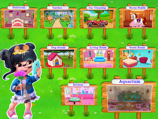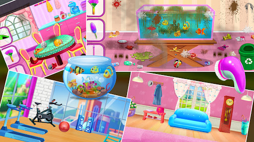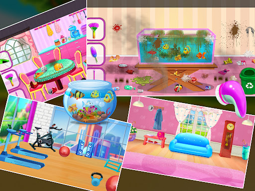 Take care of your beloved puppy dog, fish, and horse. You have a large living room, gym, car wash, dog house, kitchen, aquarium and many more. Make your cute dog home and make his smile beautiful. Now update the swimming pool, clean the playground, wash the cars, decorate the house, clean the puppy house, toilet. You can also enjoy a fun game! Home decoration. Decorate rooms with beautiful castles for girls. Do housework with cleaning games for girls and compare the levels of your families. Start your home decorating journey.
