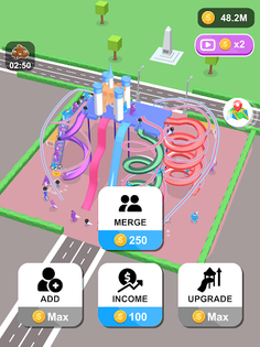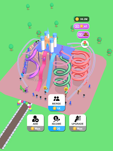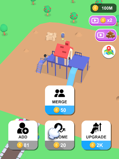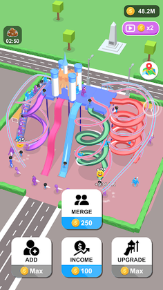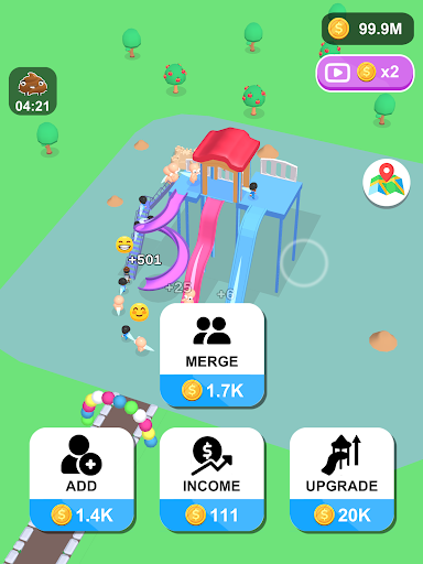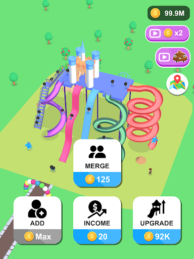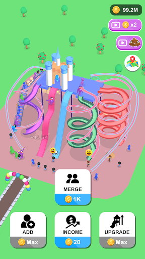 Players start with a straight slide and earn money every time someone slides down it. Players can use the money to increase the number of people using the slide, merge three characters into higher-level characters with different colors and styles, and upgrade the slide to increase the number of people who can slide at the same time.