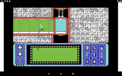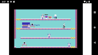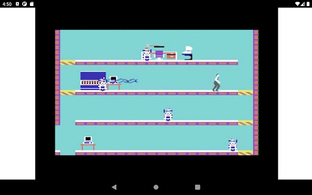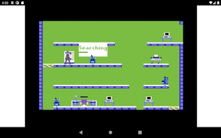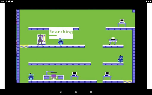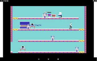The game: your task is to put a stop to evil Elvin Atombender's game. For this you have to enter his laboratory, protected by a vault somewhere in his underground stronghold. To open the laboratory's door you need a nine letter password, each letter of which Elvin coded into a punchcard, cutting each card in four, painting them in different colors and hiding the resulting pieces everywhere in his base's furniture. So all you have to do is search every object of every room for pieces of the puzzle while surviving the robots, the pits and doctor Elvin's annoying voice, retrieve all 36 pieces, put them together in groups of four, and head for the laboratory, where an unpleasant surprise awaits you.