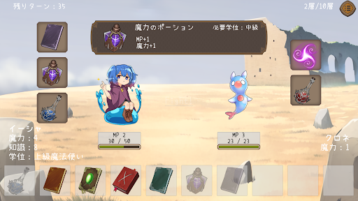 Explore dungeons with Eisha, using magic books and tactics. Collect items, vanquish enemies, and aim for the top score. Reach 5-star levels.