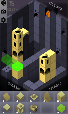 that are provided in the area at the bottom to build a track for the ball to get to the hole without falling and breaking. Repeatedly click an object in the bottom area to rotate it. Drag the block to place it. Click erase then click on the block twice to remove it