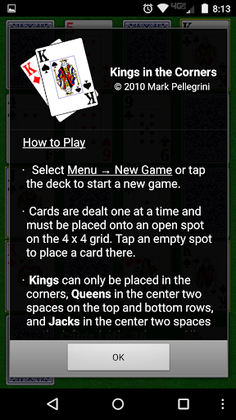 This app is a key that unlocks the Pro features in the free Kings in the Corners game. YOU MUST ALSO HAVE THE FREE VERSION OF THE GAME INSTALLED TO PLAY. To upgrade, install both the free version and this pro version of the app. Then launch the free version as normal and the Pro features will be unlocked.