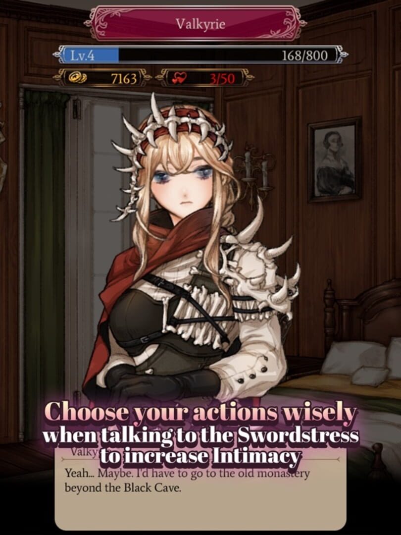 This game offers a unique hybrid genre that combines elements of dating simulation, business simulation, and auto RPG. You must choose your words carefully when interacting with the Swordstress in order to increase your intimacy rank.