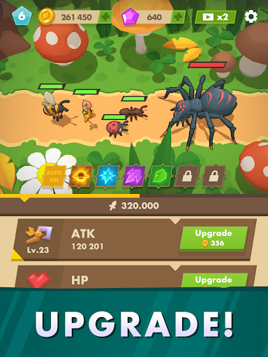 The game features an auto battle system where your army of insects will automatically fight against the enemy. You can also tap on the screen to perform special actions and unleash epic attacks. As you progress through the game, you can collect and upgrade your army to make them more powerful.