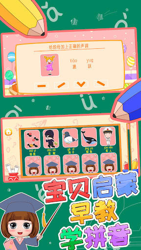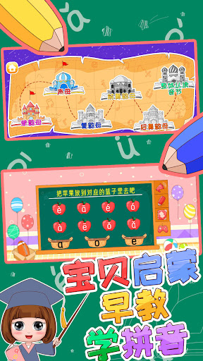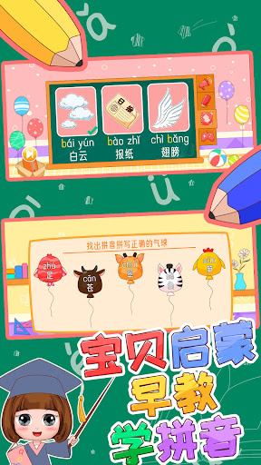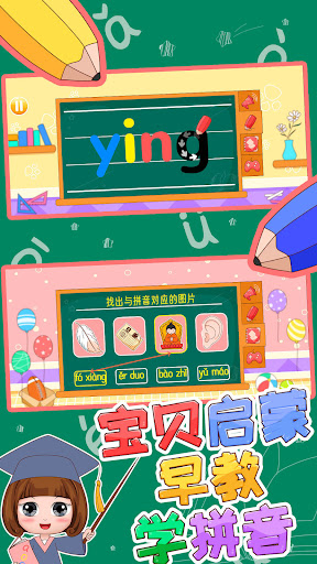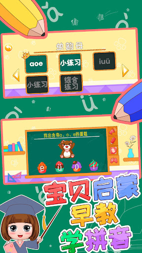 The game has an interesting stage mode, children can play games and do exercises. Also they can learn pinyin and related knowledge while playing games, including listening, writing, reading and practicing. The game contains 3 pinyin classification, finals, initials, the whole-read syllables, including the minor classification, single finals, nasal finals, 63 pinyin in total. There are hundreds of pinyin combinations and common Chinese characters in the game.