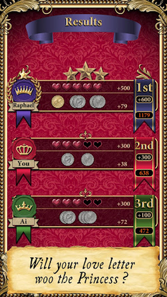 You will have only two cards in your hand at any given time, so it's important to draw and play your cards wisely in order to get closer to the princess. Each character staying in the castle can aid you in different ways. Guards and princes can help discredit other suitors' letters, priests give you insight into your rivals, and the handmaiden will protect your letter at all costs.