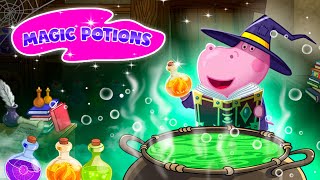 Hippo family has a very interesting relative aunt Morgana. Why is she so interesting? First of all because of the fact that she is a real witch! But it is no use to be afraid, nothing bad won't happen. Instead of bedevil somebody or flying with a broom, this lady works in the forest sorcery shop with exciting potions. She is a certified alchemist, she can make magic potions for any case in life. And also a good sorceress helps anybody who comes to her shop. But even a good sorceress can't work forever. Once she decided to make a holiday and fly to Miami Beach with her broom. But there are so many clients coming to the shop every day. Could all the people who need an urgent help not to get it? The Witch has a niece, she can work while her relative is on holiday. Today the main witch is our curious Hippo! But what to do if the niece is not an alchemist? How could she make a magic potion without a sorcery certificate? We need your help! Find book, where there are all the recipes, potions and ancient maps, where there are also places with ingredients pointed on the map. Find the correct ingredients on a graveyard, in the ghost castle and in the swampland! Make magic potions and experiments, play the games and create new unbelievable spells!