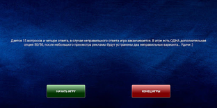 В игре доступна одна опция 50/50. Игра заканчивается, если игрок правильно отвечает на 15 вопросов или ответил неправильно...