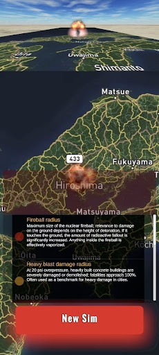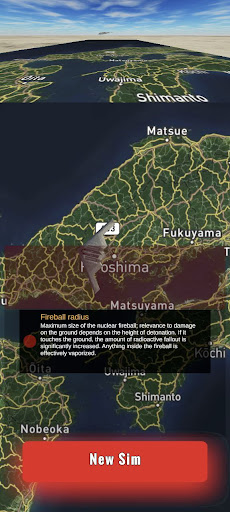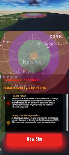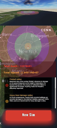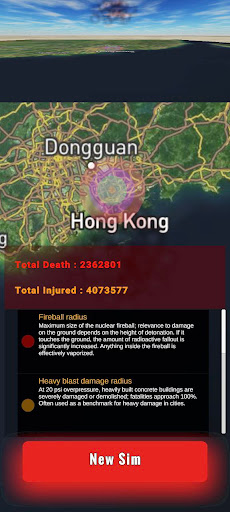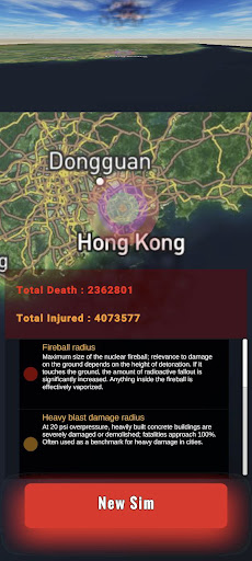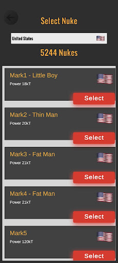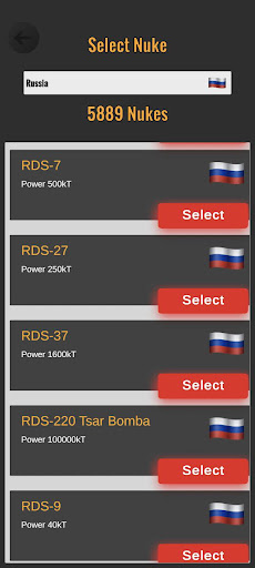 Select a nuclear weapon from the arsenal of a list of countries such as the United States, Russian Federation, China, the United Kingdom, France, India, Pakistan, Israel, and North Korea and simulate it on a 3D real world map to see the effects by means of visual and graphical effects.