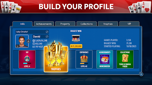• YOUR OWN PROFILE PAGE – Track your progress and status in the game! Get experience and level up. See how many poker tournaments you've won and achievements you've completed. Get unique property and display it on your profile. View other players' profiles to see how you compare!