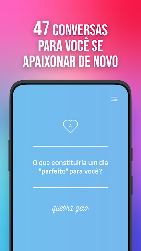 RECURSOS DO JOGOPaixão 47 apresenta uma coleção de 47 conversas divididas em dois conjuntos: Quebra-gelo, Conexão Emocional e Amor Verdadeiro, seguidos por Infância e Lembrança, Intimidade e Romance, e Futuro Família.