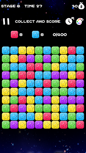 This game is different from other three elimination or line elimination games. As long as two squares have the same color, stars can be eliminated. There are many levels in the game. With the increase of levels, the difficulty of the game is increasing. You are required to achieve higher and higher scores and constantly challenge yourself. Although the game is simple, in order to continuously sprint to a higher level of difficulty, players need to think carefully about the layout of each step after eliminating stars. Eliminating stars is definitely a wonderful small game to kill boring time.