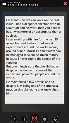 Analyze every clue, keep an eye on each detail. Solve cryptograms, codes, audio, videos, and connect the dots to solve the majestic mystery of Dr. Quantum and his nemesis.