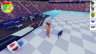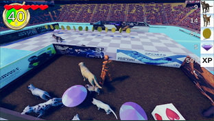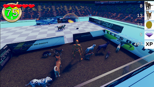 The field moves like a conveyor belt toward a wall of death. You must keep moving or you will crash into that wall and die. When cats and dogs land on the field, they walk toward the wall. Try to save as many cats and dogs as you can before the level timer expires. Pick up the animals before they hit the wall and carry them to a pen where they will be safer. Pens exist on each side of the playing field, and they move back and forth with you, so you don't have as far to travel.