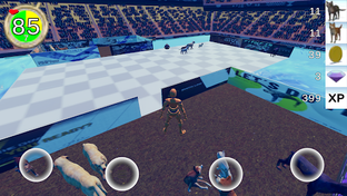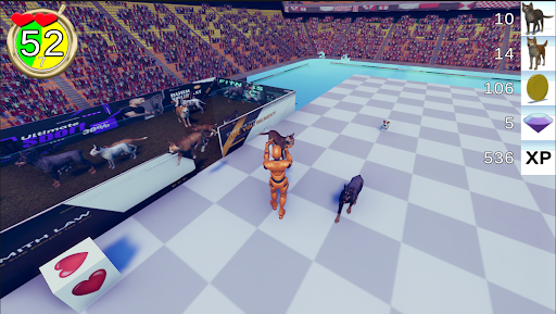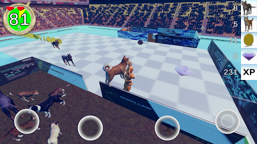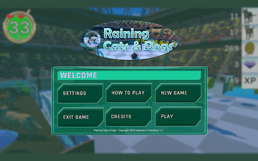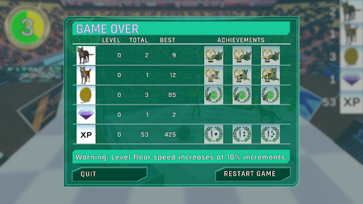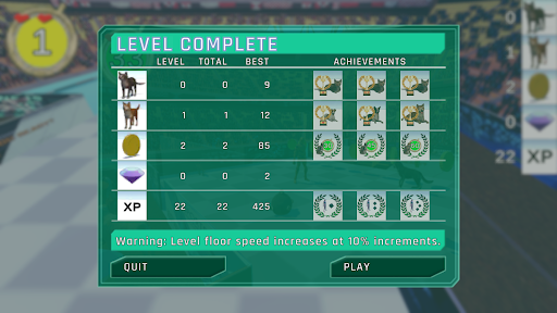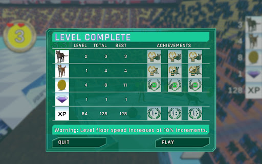The game has ten levels. The first level starts at 30 seconds. Subsequent levels increase by 15 second intervals giving you more time to save cats and dogs. Be warned that the field speed increases 10% for each level as well. So, cats and dogs are moving faster toward the wall of death. And so are you. The last few levels can be quite a challenge with lots of animals, gems and mines falling from the sky while you race to survive.
