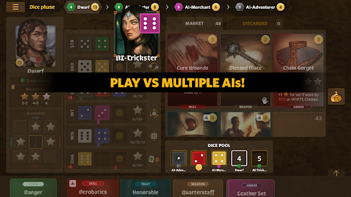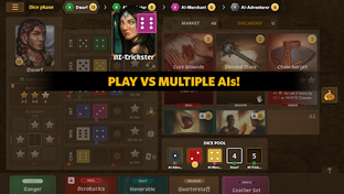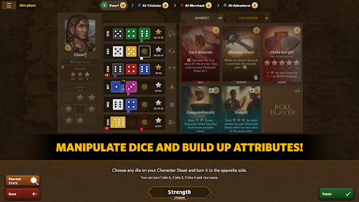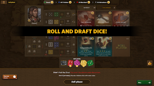 In Roll Player, the ultimate goal is to create the most powerful and impressive RPG character. This digital adaptation of a classic board game combines strategic gameplay and dice manipulation. Players roll and draft dice to increase their character's attributes, then can purchase weapons and armor along with traits and skills in a market phase. The catch is that players are randomly assigned an RPG class, alignment, and backstory at the beginning of the game which they must optimize alongside their character attributes through clever dice usage.
