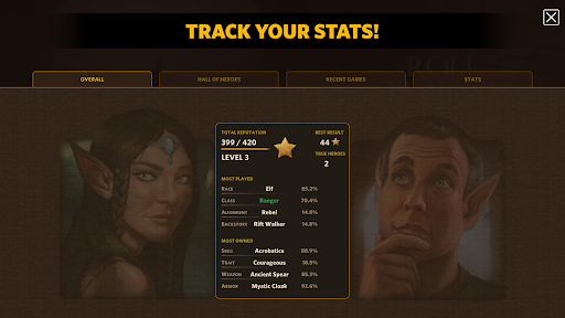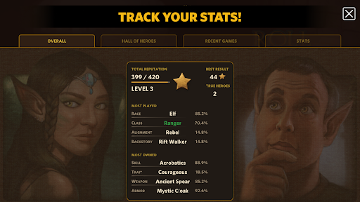 To win the game, players must earn Reputation Stars, which determine the ultimate success of their character in the tabletop role-playing world. Reputation is gained by creating the most optimal character sheet, which is then stored in the Hall of Heroes for bragging rights.