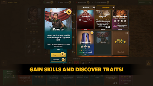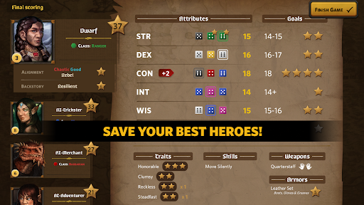 Roll Player: build your RPG character through dice manipulation, market purchases & backstory maximization. Compete for Reputation Stars. Multiplayer.
