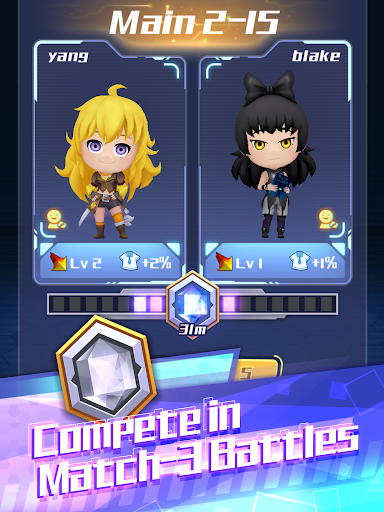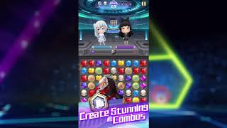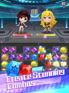 Competitive match-3 puzzles featuring RWBY characters, customizable outfits, and unique abilities, with rewards to top the leaderboard.