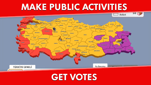 Choose your favorite party or create your own custom party with your own character. Travel across Turkey to attend rallies and events, and make appearances on TV to attract voters and gain their support.