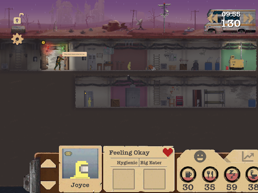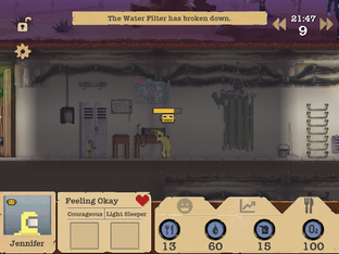 In Sheltered, a nuclear family seeks refuge in a concrete underground shelter. With scarce resources and threats from the outside, players must make daily moral choices to survive in post-apocalyptic conditions.
