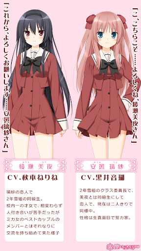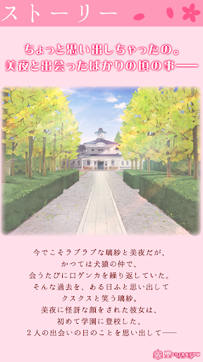 その花びらにくちづけを 出会った頃の思い出に" is a mobile girl's love adventure game featuring the romantic story of Risa and Miya's first encounter.