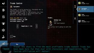 Explore new systems, and trade commodities to earn credits! Establish relationships with local traders to get better deals. Can you figure out the best trade routes?