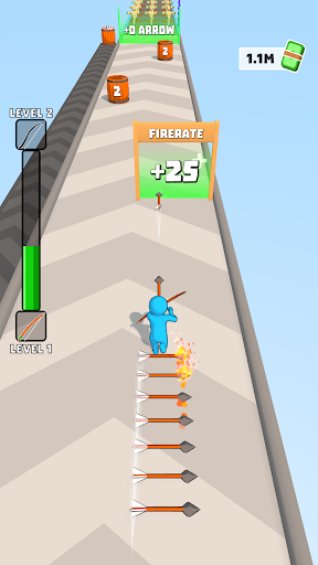 Collect arrows by shooting the wooden barrels on the runway. You can shoot more powerfully with your level up arrows!
