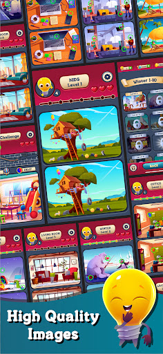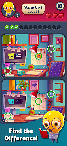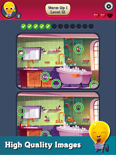 Don’t worry! Finding differences is easy with Bulbman. If you can’t find any difference, Bulbman will be happy to help you and give you hints. At the beginning of the game, Bulbman will give you 3 free hints as a gift. If you run out of hints, you can buy them with coins or purchase them.