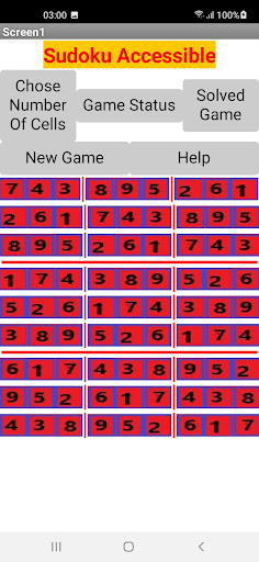 The game is suitable for all people but especially helps those who use Screen ReadersFeatures* Unlimited number of games* Six different levels of difficulty for participant selection* The app does not allow duplicate numbers* The app displays information about: The numbers in the row, in the column, and in the 3x3 square when you are on a certain cell* The app displays the allowed numbers for the cell without the need to go over each cell in the row, column and 3x3 square* The app allows you to choose only allowed numbers and avoid duplicates* The app displays status at any point in time