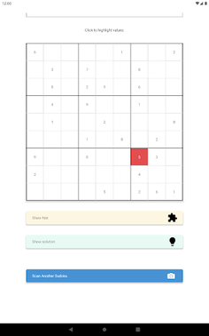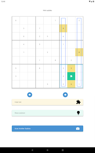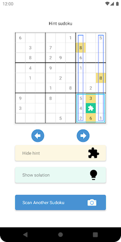 Still not clear? Hit the 'Show Hint' button! The app highlights the smallest number of rows, columns, or blocks as well as previously derived values, that together allow you to derive a new value.