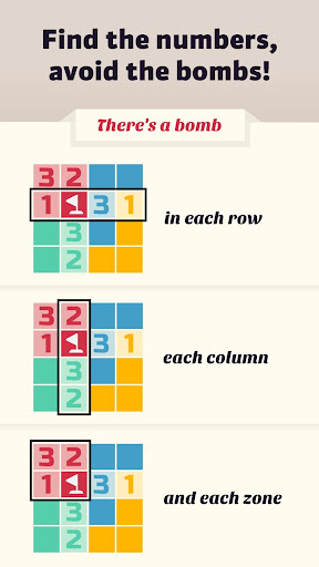 Every row, column and zone contains a bomb and one of each number.