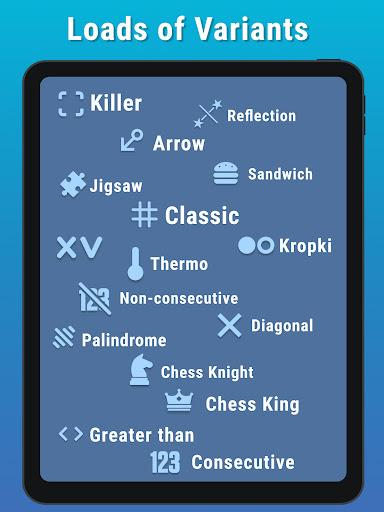 Explore diverse variants of Sudoku, including Classic, Killer, Sandwich, Jigsaw (Irregular), Thermo, Diagonal, Arrow, Skyscraper, Windoku, Zipper Line, X-Sum, Little Unique Killer, Consecutive, Non-consecutive, Palindrome, Kropki, German Whisper, Chess Knight, Chess King, Bishop, Greater-than, XV, Reflection, Quadruple, Slingshot, Slow Thermo, Even Odd, Between Lines, Lockout Lines, Running Cells, Ascending Series, Dutch Whisper, Renban, Universal, and Couples. Expect new releases and fresh variants in each update of the Logic Wiz mobile application.