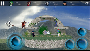 Start with 2 stages and unlock 3 more. Some stages have one-way platforms which you can jump down through by pulling the joystick downward. Some have a pit you can knock an opponent into. There is even a side-scrolling stage keeping true to the platformer genre despite the fighting aspect.