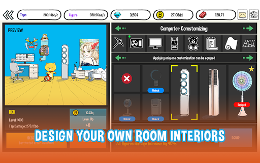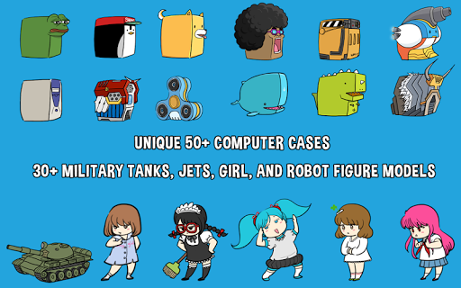 Upgrade your computer using many different parts, unique electronic collections and multiple stunning figure models such as military tanks, jets, girls and robots. Choose from a selection of 50+ computer cases, design your own room interiors, complete multiple achievement missions and get rewards for hacking into large enterprises. Participate in weekly competition events to boost your winning chances.