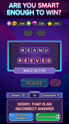Spend your points wisely to select letters, with vowels costing 15 points and consonants costing 5 points each. Guess the hidden phrase and win, or use gems to get hints and make it to the next level. With over 1000 levels and 10,000 trivia question phrases to solve, Trivia Puzzle Fortune provides hours of entertainment.
