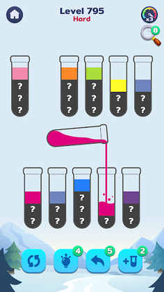 Sort colorful water in the tubes until all colors are divided into the right tubes!