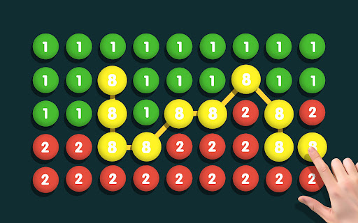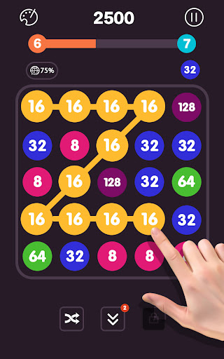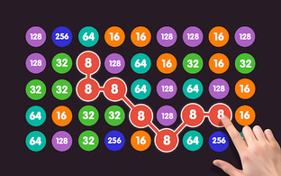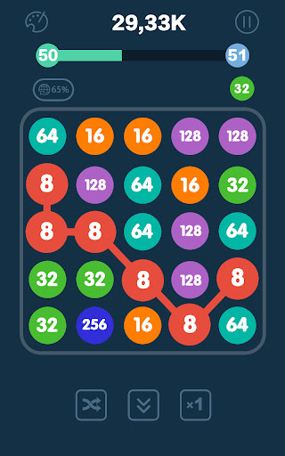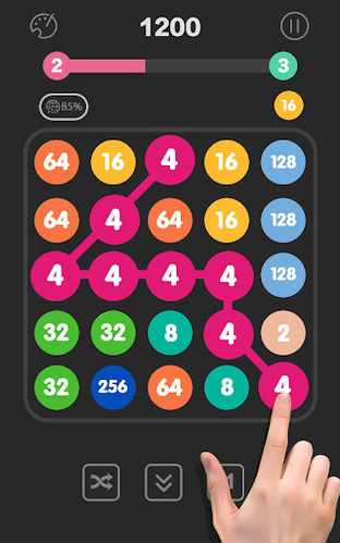 The goal is to connect the same numbered bubbles so that they merge into a higher number.