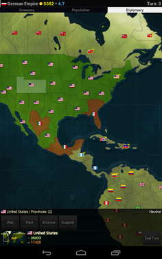 - Use the Economy and Population buttons to view each province’s Economy and Population values. Use the diplomacy button to view each province’s owner and engage in diplomacy (see Orders- Diplomacy View).