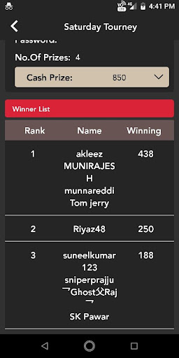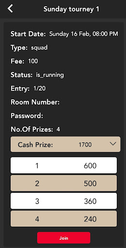 4.join tourney using tourney menu you have to select the team from friend list then pay the entry free , after payment is successful you can view your team number prize details in details tab you have to be seated in allocated team number or else you will be removed from tourney.