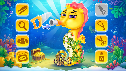 Explore the deep blue sea and help marine animals like seahorese, whales, turtles, sharks, pirana, octopus by treating their wounds, cleaning up pollution, and ensuring their happiness.
