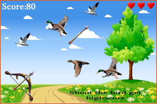 Bird Hunting archery is a simple bird archery shooting game using arrows. The goal of the game is to shoot the birds. If you miss bird then you will lose your one life.