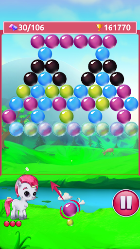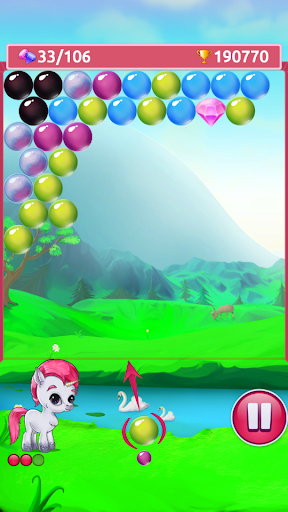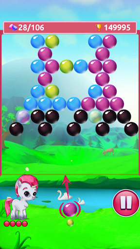 Combine at least 3 bubbles of the same color to remove them from the field. Clear adjacent bubbles to drop the gems and make the little unicorn happy. Plan ahead and play strategically - dropping huge clusters will trigger Una's rainbow move and gives you lots of bonus points! Beware of black bubbles, they can only be removed if you clear all bubbles next to them! Can you collect all gems and earn a high score?