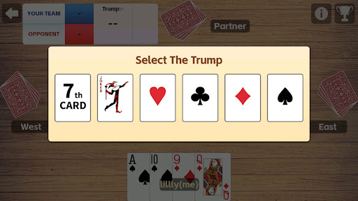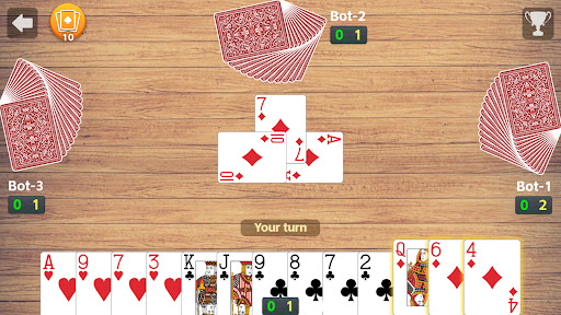 The Callbreak game consists of 5 rounds, each with 13 tricks. The player is required to play the same suit card for each deal. The trump card by default is the spade. After five rounds, the player with the highest deals wins.