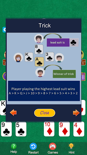 After each player completes their call, player next to dealer will make the first move, this first player can throw any card, suit thrown by this player will be the led suit and each player after him/her must follow the higher rank of same suit, if they don't have higher ranked same suit then they must follow with any card of this led suit, if they don't have this suit at all then they must break this suit by the trump card( which is Spade of any rank), if they don't have spade also then they can throw any other card. The highest card of the led suit will capture the hand, but if the led suit was broken by spade(s), then in this case highest ranked card of spade will capture the hand. The winner of a hand will leads to the next hand. In this way the round continues until the completion of 13 hands and after that next deal will begin.